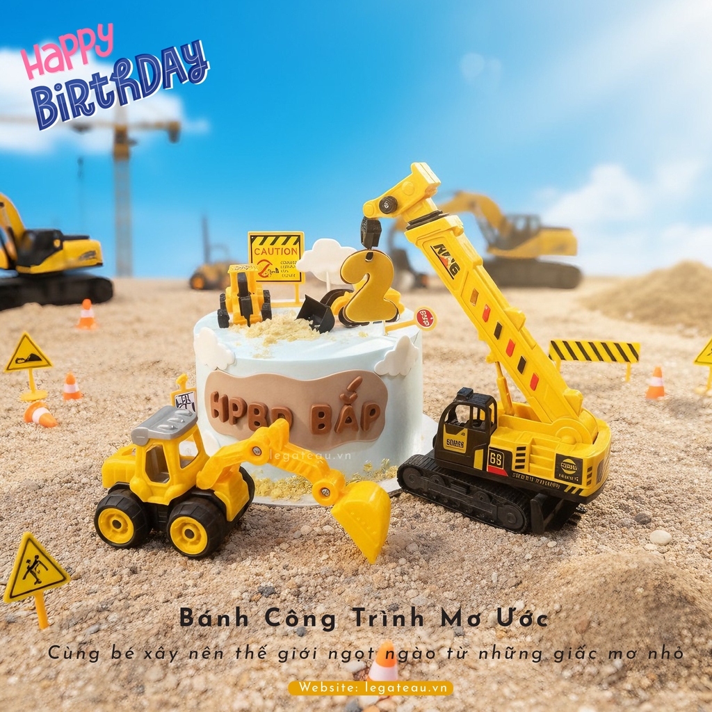 Chiếc bánh mang sắc vàng nổi bật của những chiếc xe công trình mạnh mẽ, kết hợp cùng lớp cốt bánh vanilla mềm mịn và kem phô mai nấu béo ngậy, tạo nên hương vị hấp dẫn khó cưỡng. Với thiết kế tinh tế mô phỏng khu công trường thu nhỏ — từ máy xúc, xe tải đến bảng cảnh báo “Caution” — chiếc bánh không chỉ ngon miệng mà còn là món quà tuyệt vời dành cho các bé trai yêu thích xe công trình và thế giới xây dựng.
