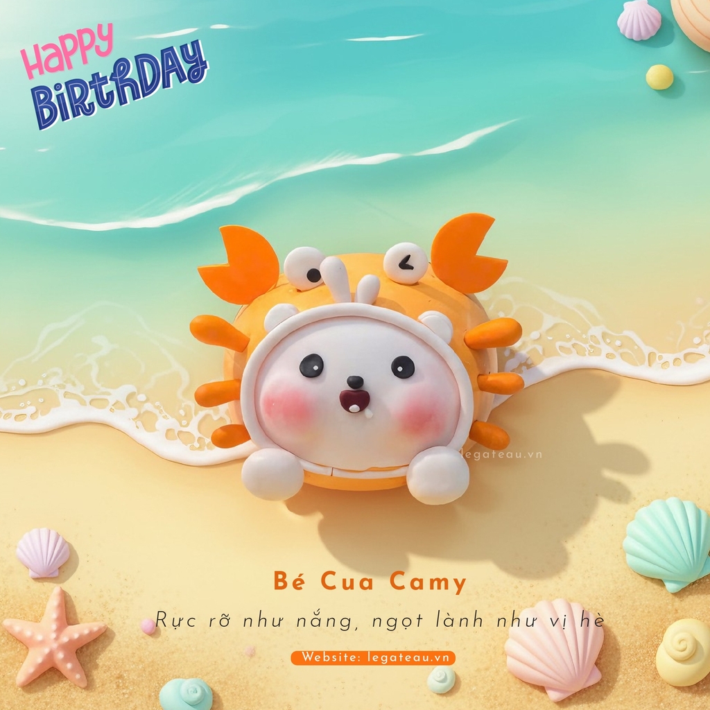 Bé Camy là cô cua nhỏ rực rỡ của biển khơi, lúc nào cũng vui tươi và lan tỏa năng lượng tích cực. Với lớp bánh vanilla mềm mịn, phủ kem phô mai nấu và trái cây tươi rực rỡ, Camy mang đến vị ngọt thanh như nắng hè, khiến ai nhìn cũng phải mỉm cười.