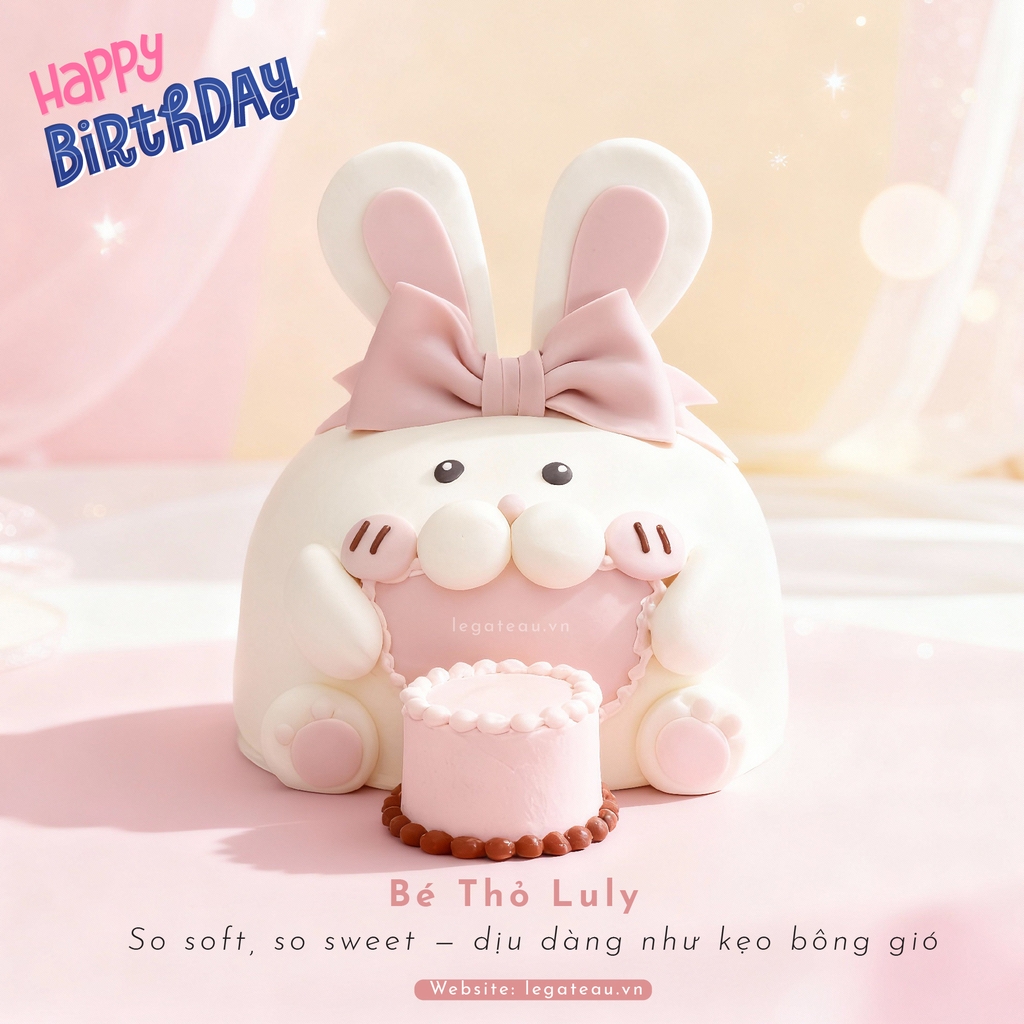 Bé thỏ trắng tròn xinh với đôi tai hồng mềm mại và chiếc nơ to trên đầu. Trong tay Luly là chiếc bánh nhỏ xinh, như đang chuẩn bị cho một buổi tiệc ngọt ngào.